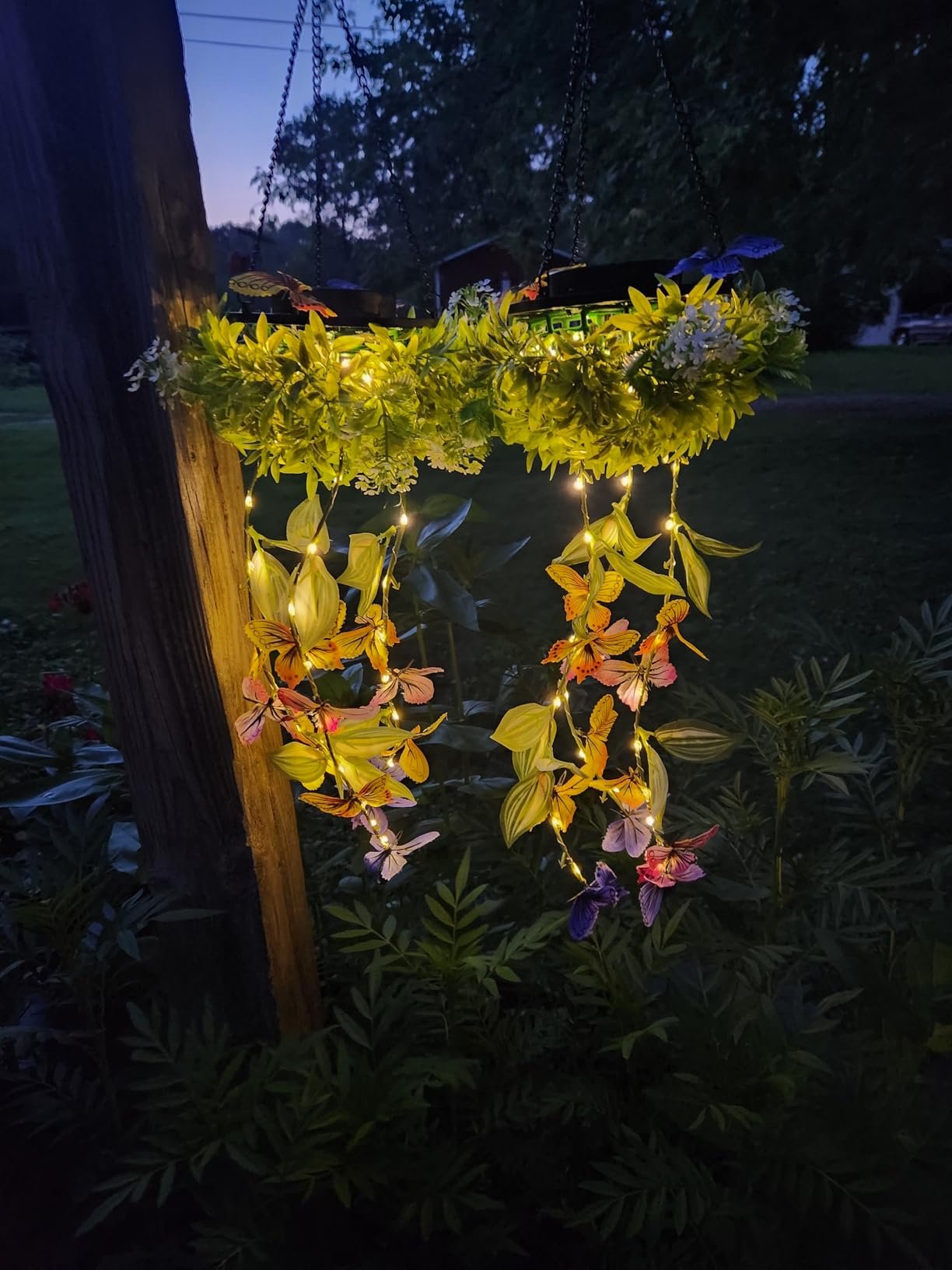Soft warm white LED lights are woven through the cascading vines, creating a magical, firefly-like sparkle at night—perfect for relaxing evenings, family gatherings, or quiet moments outdoors.